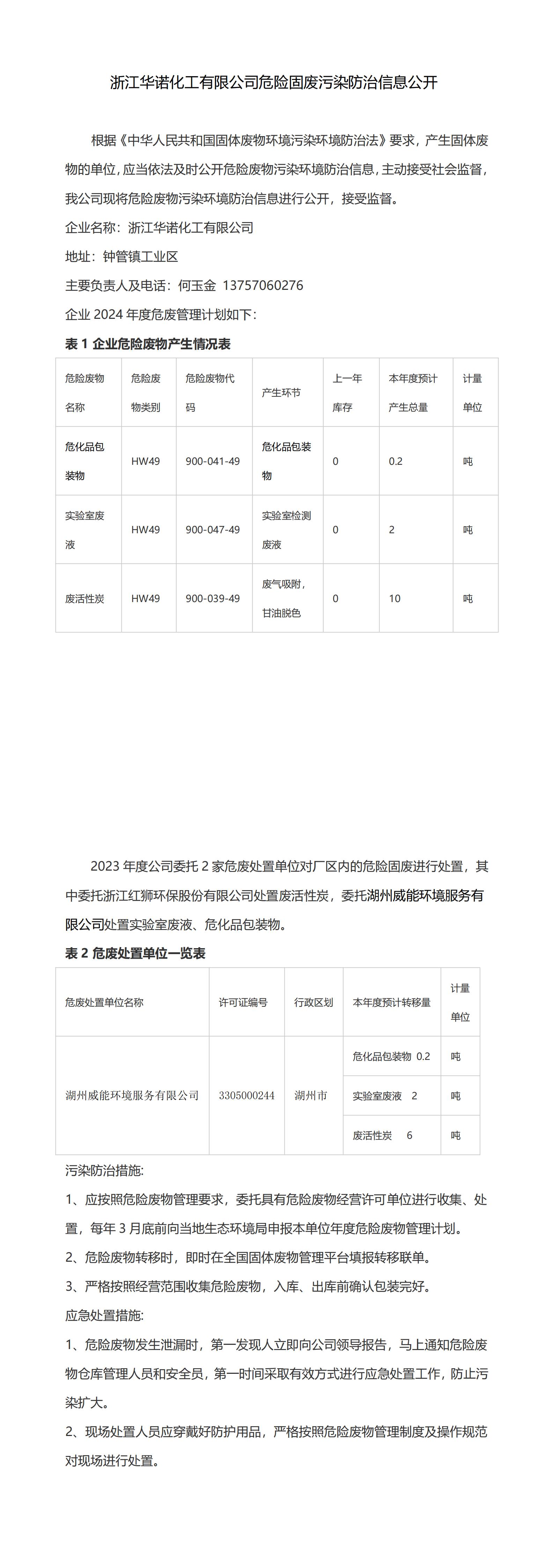 浙江華諾化工有限公司危險固廢污染防治信息公開